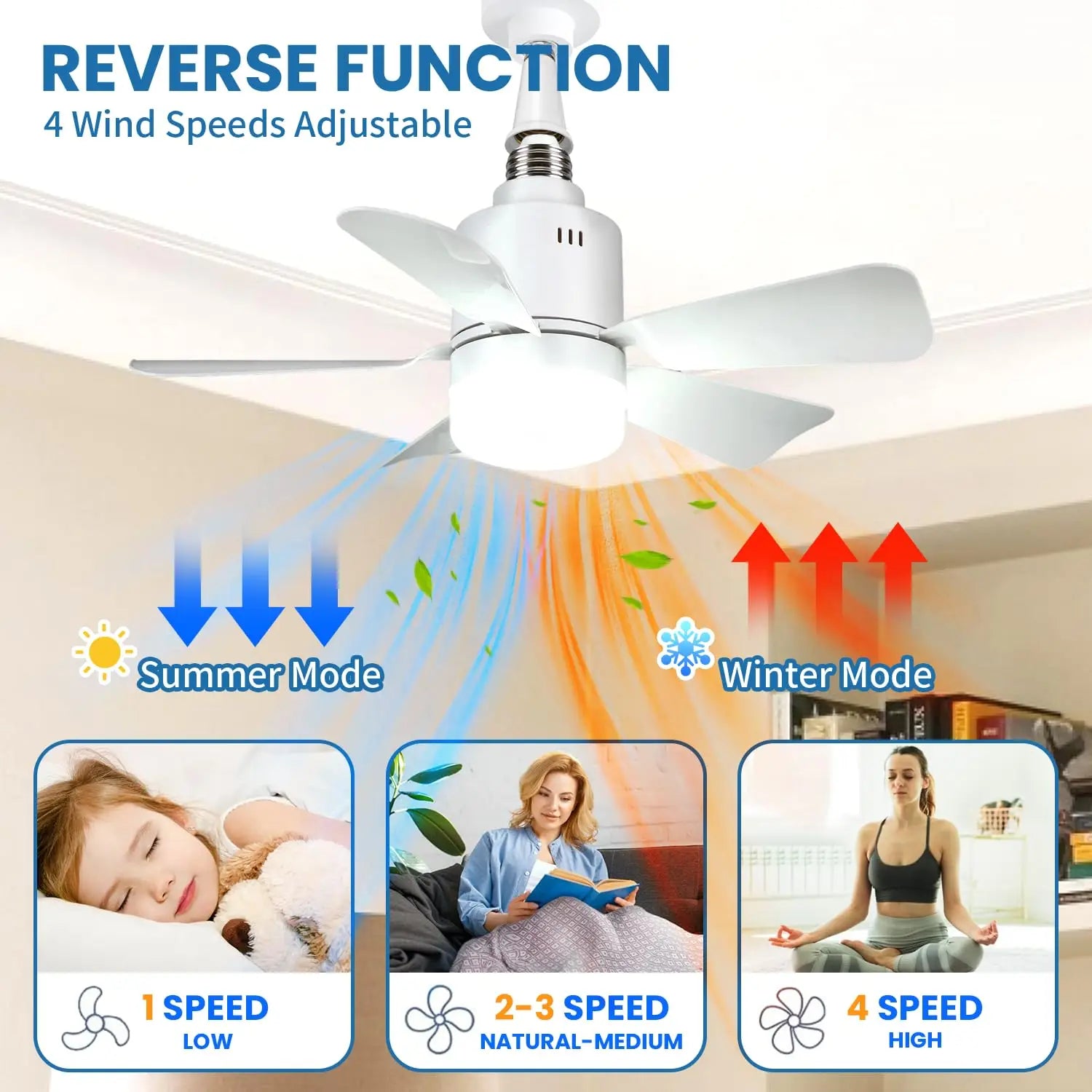 The light bulb fan provides 3 color temperature options, warm color (3000K), warm white (4500K), white (6500K) and stepless brightness (0-100%) to create the desired lighting atmosphere. The socket fan light with remote control is also more energy-saving and eye-friendly than traditional bulbs.